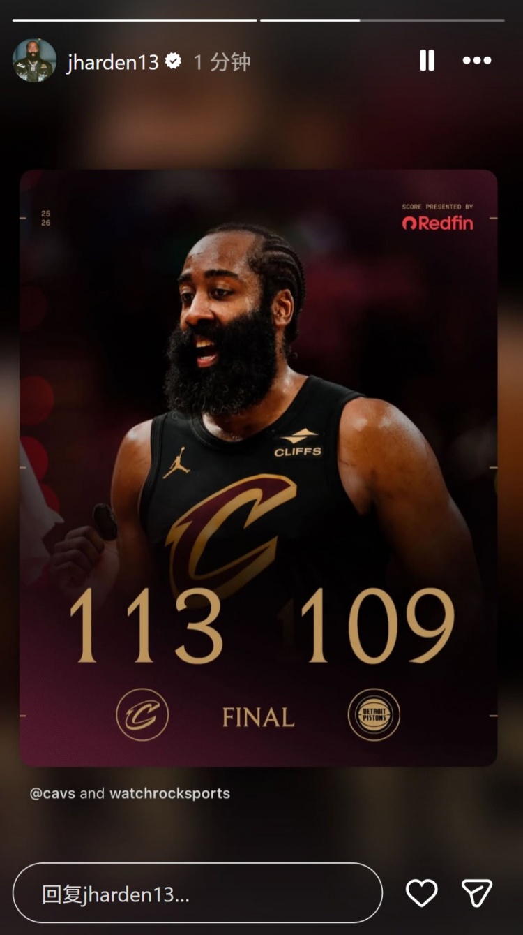 赛后哈登在INS上转发了骑士官方晒出的本场赢球海报,封面人物是自己。